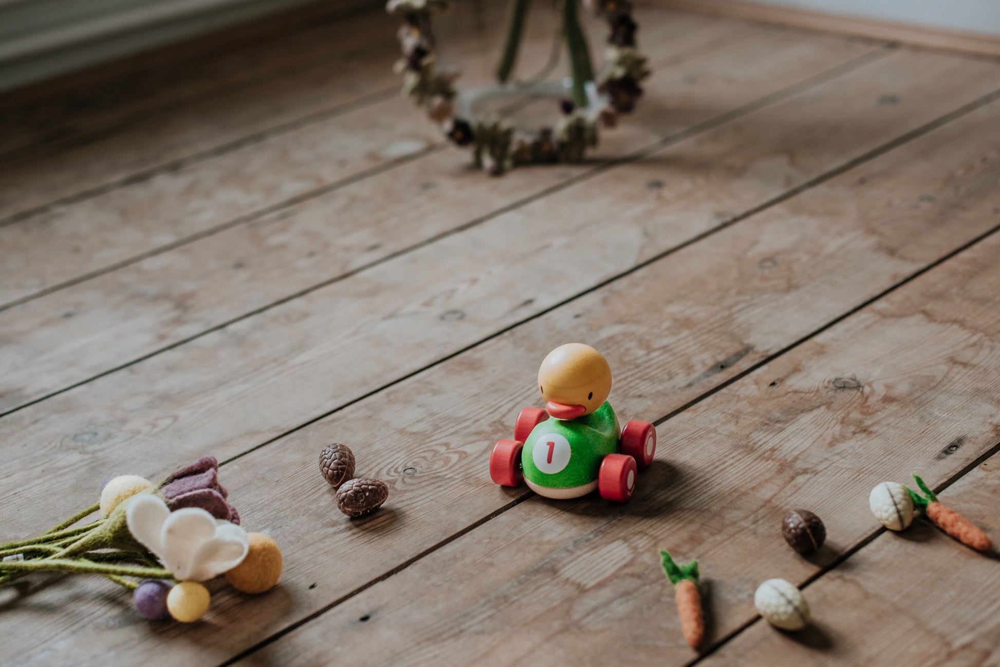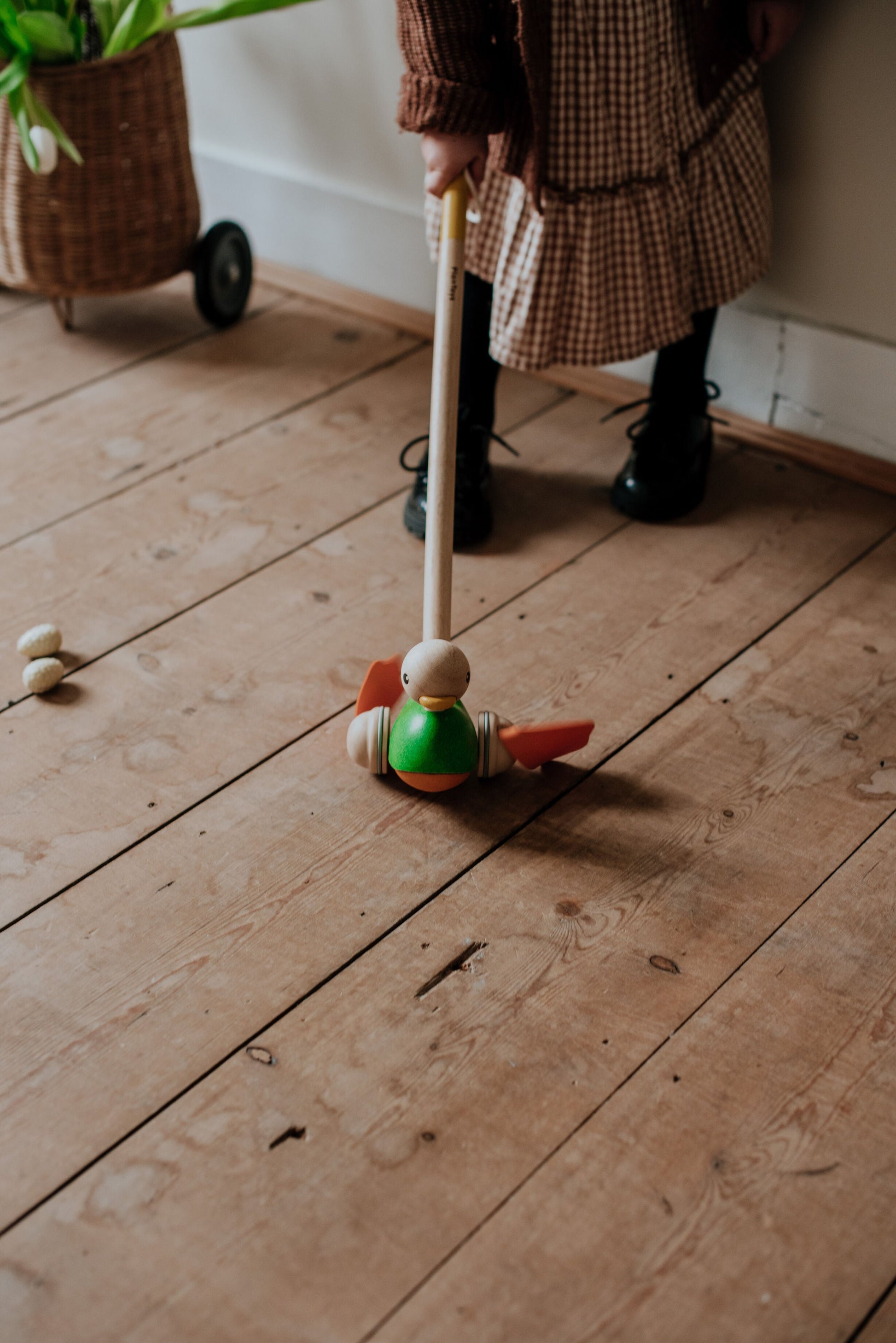 Quand bébé pousse le canard Plan Toys, celui ci avance de manière très réaliste grâce à ses pattes palmées en caoutchouc qui claquent sur le sol. Les pattes du canard sont en caoutchouc naturel facile à nettoyer. A partir de 12 mois.