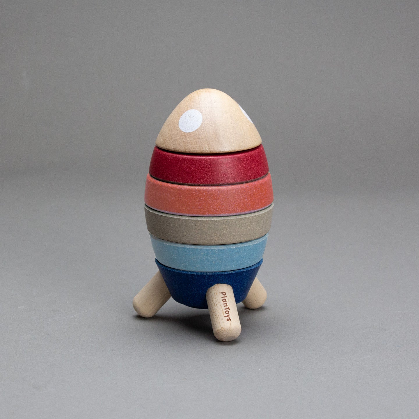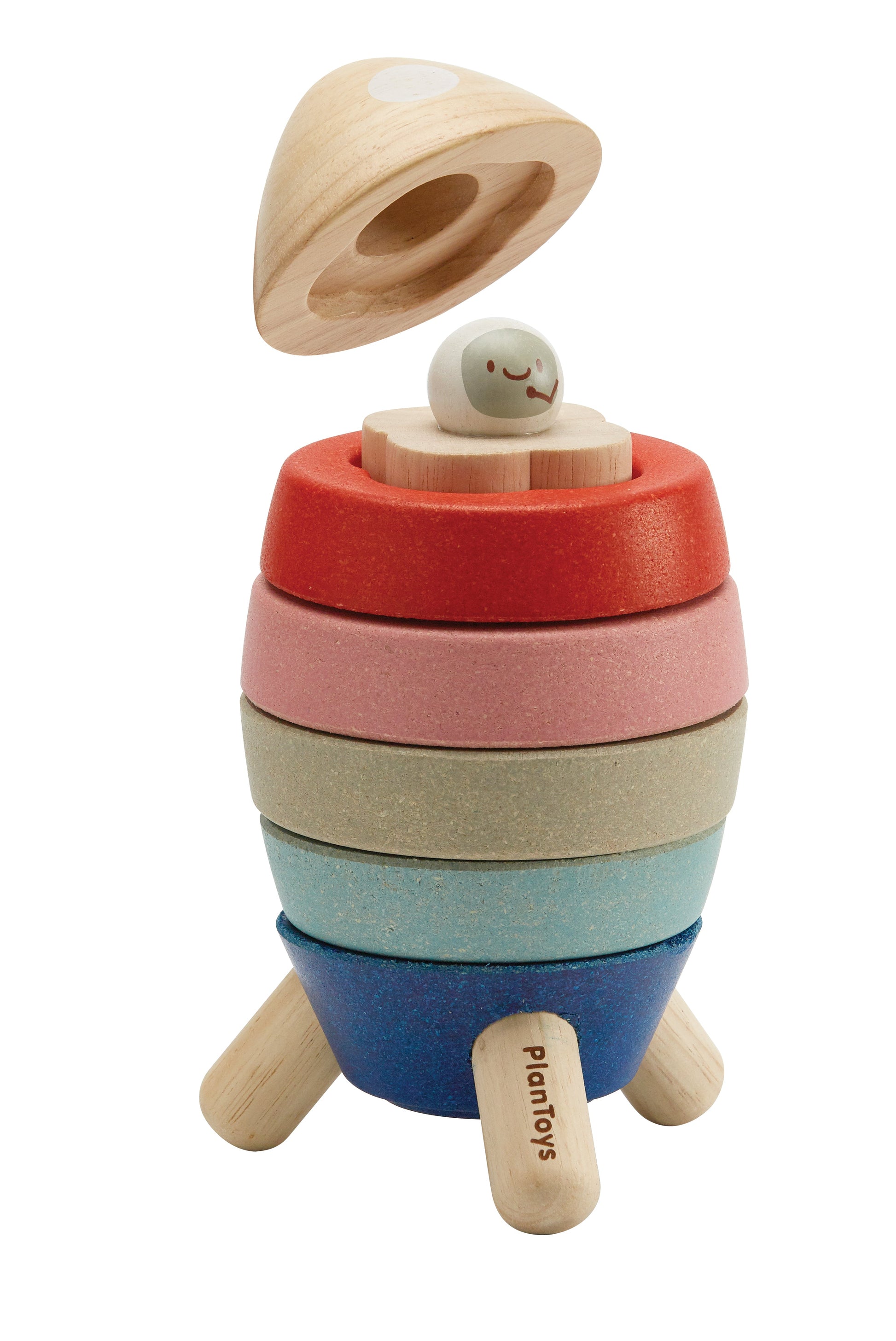 Construisez cette fusée de Plan Toys en empilant les pièces aux bons endroits, puis placez l'astronaute sur le siège et commencez le compte à rebours 3..2..1, décollage !