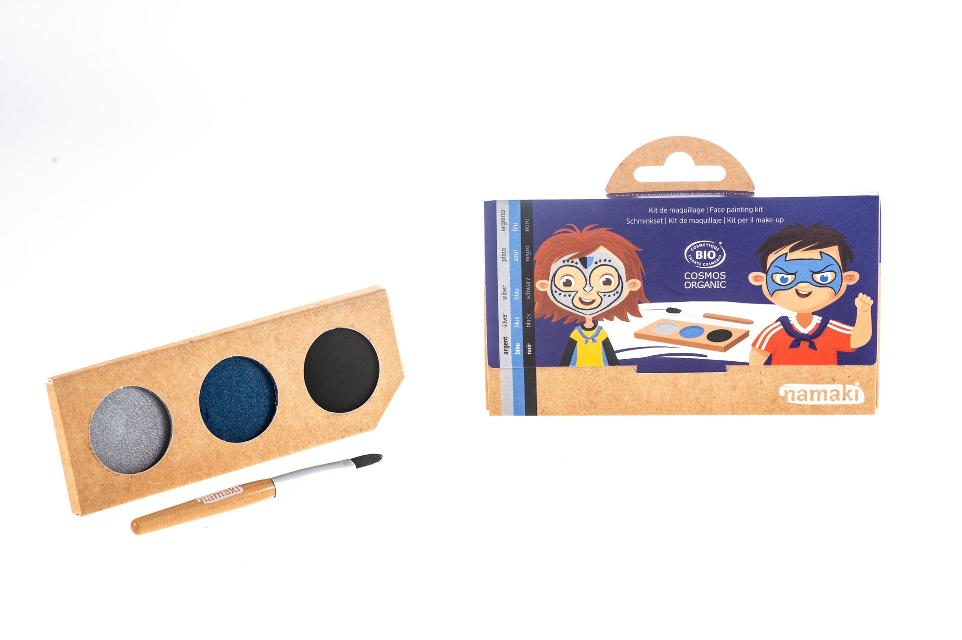 Maquille toi en chevalier ou en super héros avec ce maquillage à base d'eau, certifié bio et hypoallergénique comprenant une palette de maquillage 3 couleurs (argent, bleu, noir), 2 modèles de maquillage et un pinceau cosmétique. Jusqu'à dix maquillages peuvent être réalisés avec un seul kit : de quoi s'amuser pendant des heures !