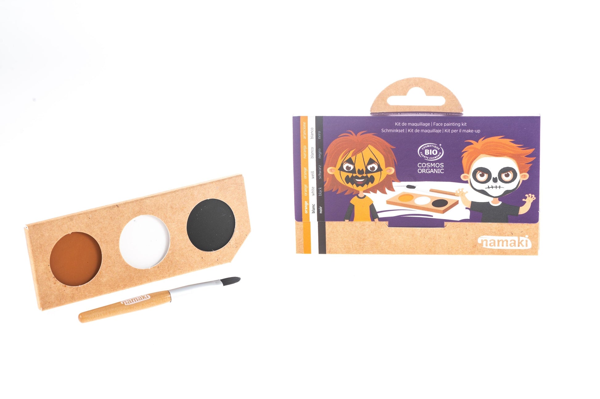 Maquillez vous en citrouille ou en squelette avec ce maquillage à base d'eau, certifié bio et hypoallergénique comprenant une palette de maquillage 3 couleurs (orange, blanc, noir), 2 modèles de maquillage et un pinceau cosmétique. Jusqu'à dix maquillages peuvent être réalisés avec un seul kit : de quoi s'amuser pendant des heures !