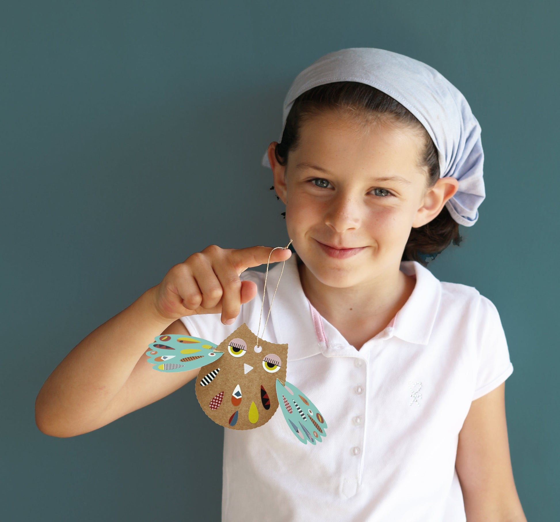 "Une activité artistique sans besoin de colle ou de ciseaux. Juste du papier et du carton à emboîter pour créer 6 charmantes chouettes prêtes à prendre leur envol. Profitez d'une panoplie de stickers artistiques en forme de plumes et d'yeux pour les personnaliser. C'est à toi de composer ta petite famille "arty chouette" !"
