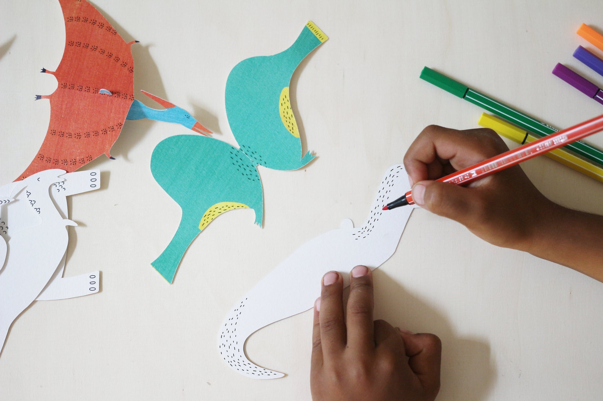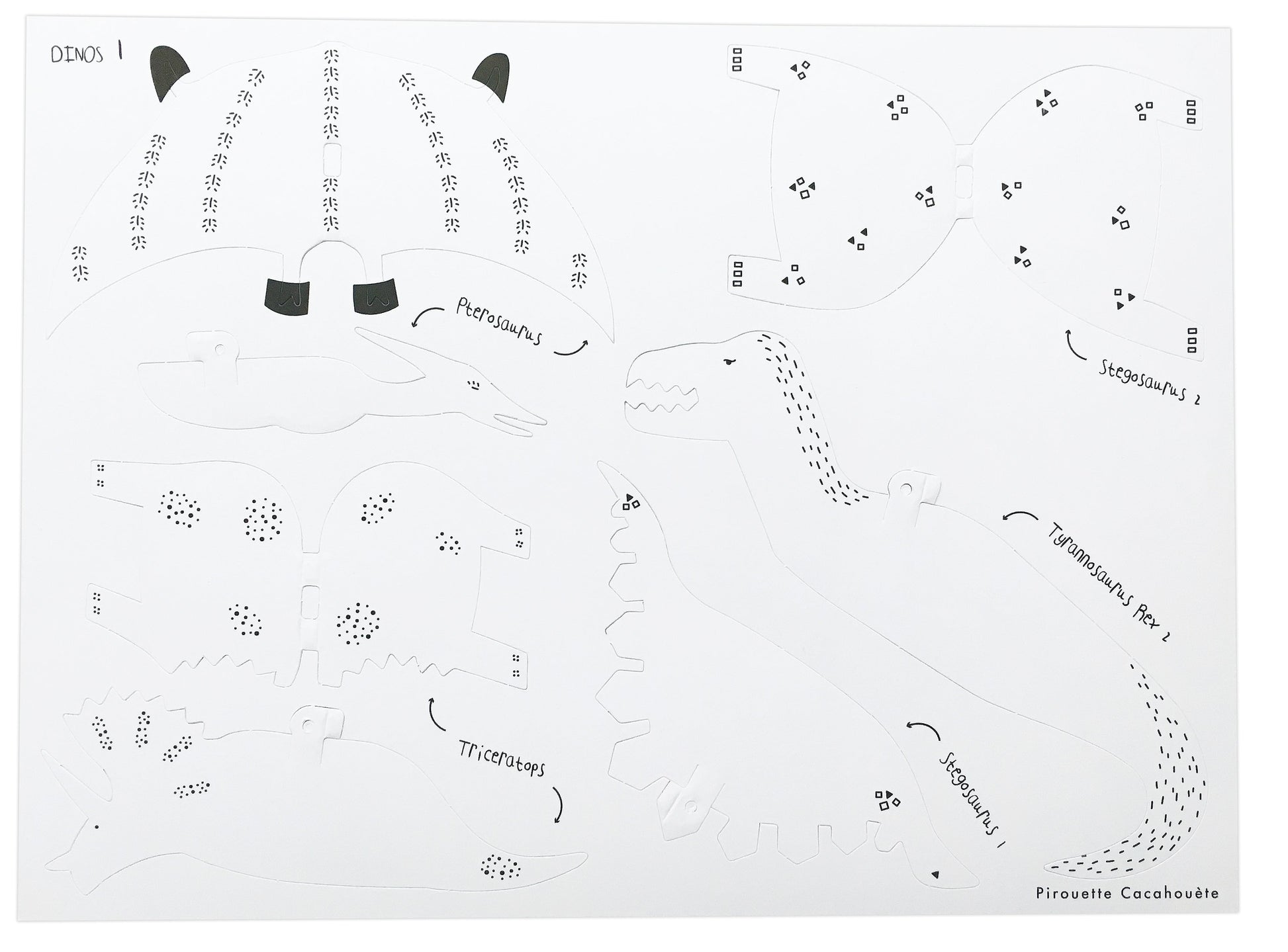 "6 Dinosaures à personnaliser : une aventure artistique sans besoin de colle ou de ciseaux pour les passionnés de l'ère Jurassique ! Assemble, colore chaque dinosaure et choisis ensuite de le poser ou de le suspendre. Grrrr !!!! Méfie toi du T rex, ses dents sont redoutablement tranchantes !"