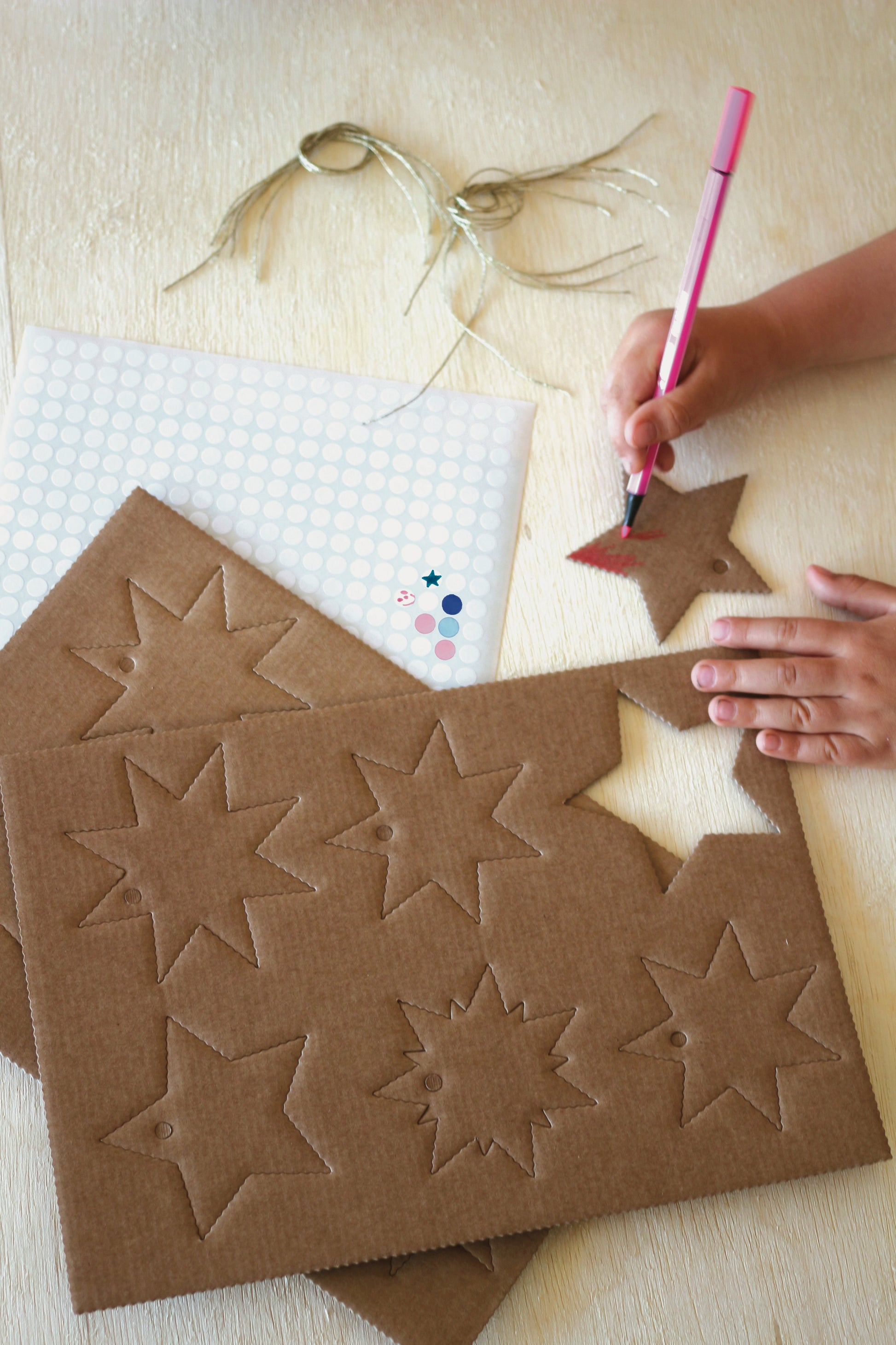 "Plongez dans un atelier décoratif où les enfants laissent libre cours à leur imagination en colorant les étoiles avec une variété de gommettes. Grâce au fil doré, suspendez les pour une touche féerique... Quel spectacle éblouissant !"