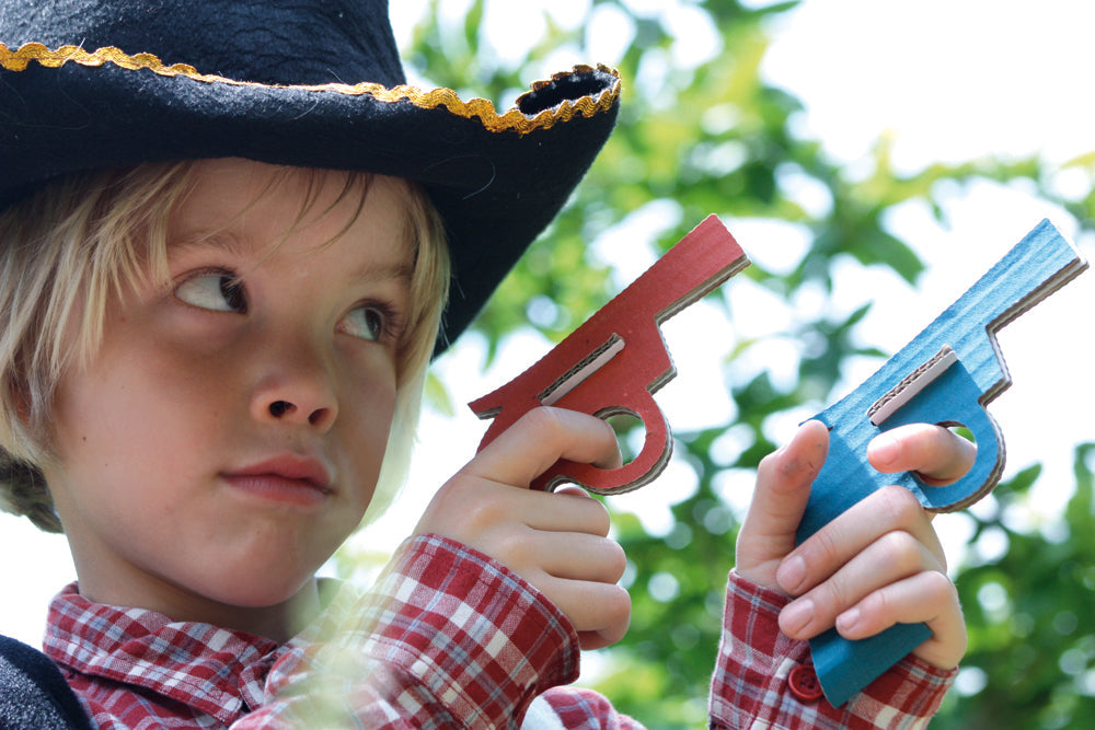 "Des colts stylisés et hauts en couleur en carton, à monter et à customiser. Plongez dans un atelier à l'ambiance Western où chacun peut endosser le rôle de son héros de légende. Que la scène s'ouvre sur les cow boys, indiens, gangsters, justiciers et explorateurs intrépides !"