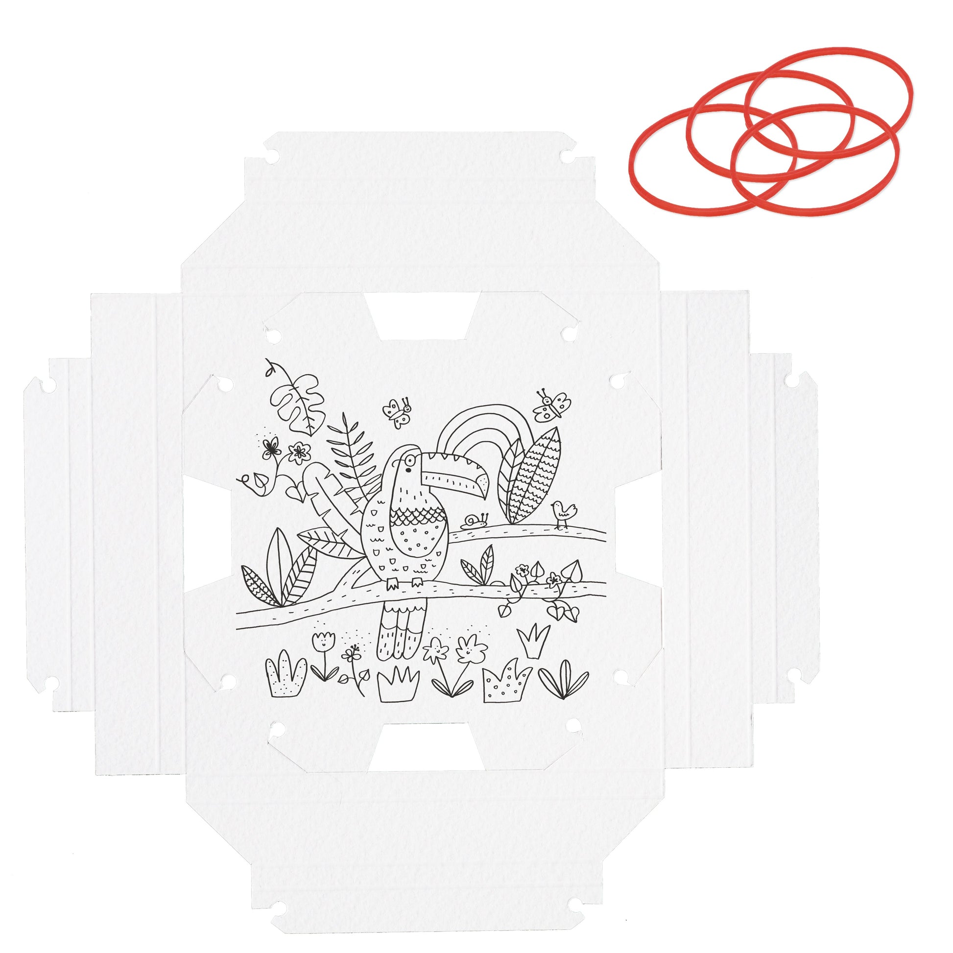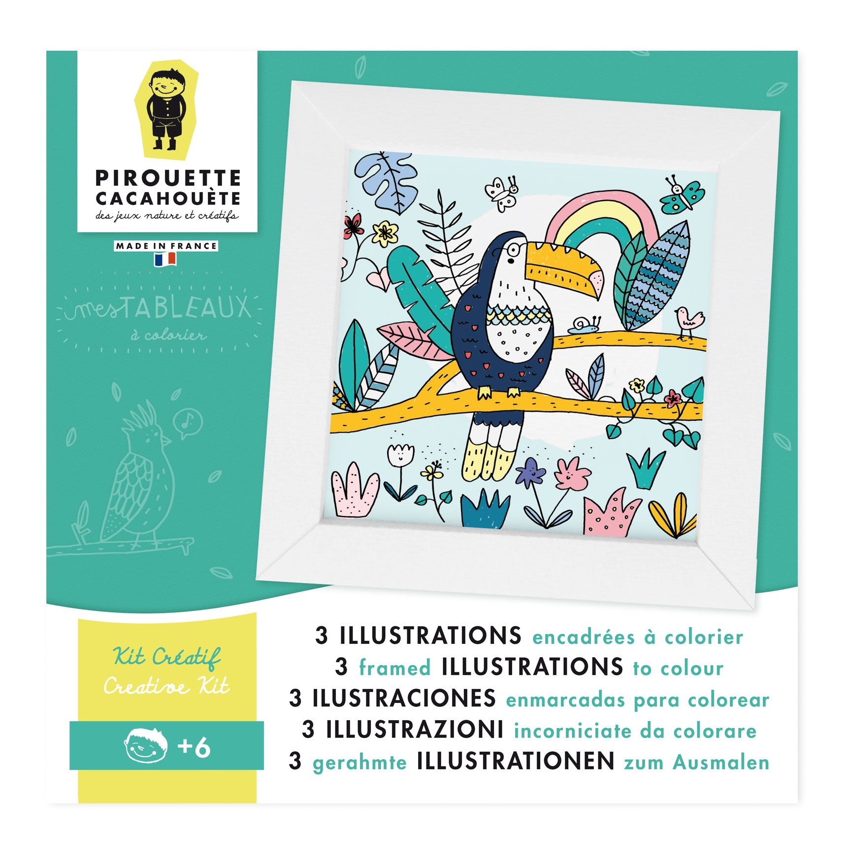 "3 Tableaux représentant des oiseaux tropicaux à réaliser et personnaliser. Plongez dans une activité à la fois artistique et divertissante. Mettez en couleur 3 dessins exotiques, puis transformez les en cadres en pliant et assemblant aisément les bords de la feuille grâce à la technologie brevetée ElastiblockTM. C'est le moment pour les talents en herbe de briller !"
