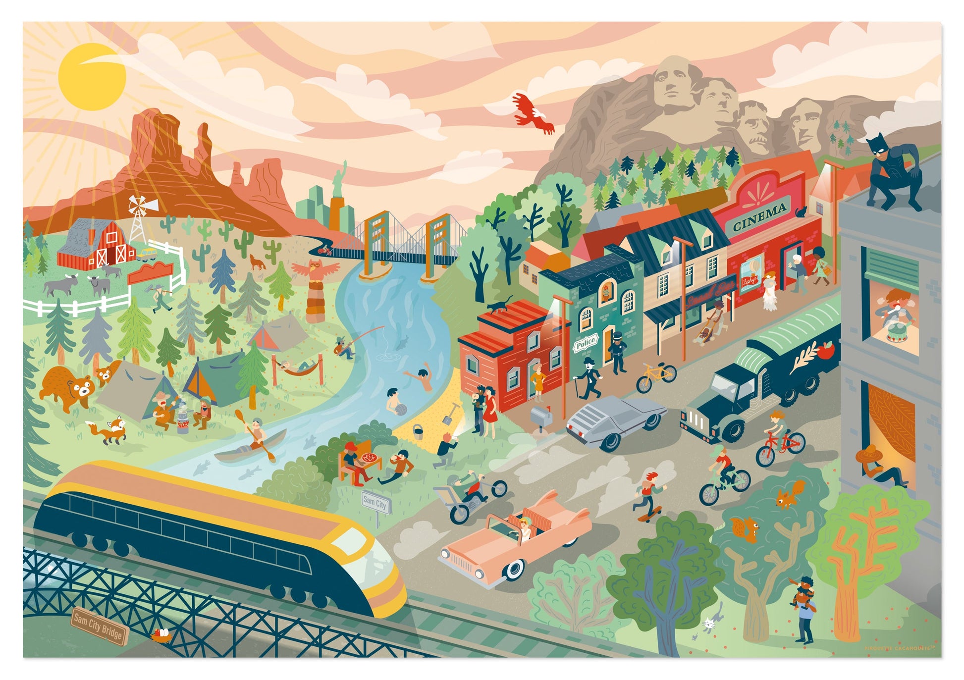 Imaginez un poster moderne dépeignant une ville typique des USA. Puis, à mesure que vous ajoutez chaque pièce du puzzle, la scène se transforme, nous ramenant à l'époque tumultueuse du Farwest. Plongez dans ce concept de puzzle innovant et époustouflant !"